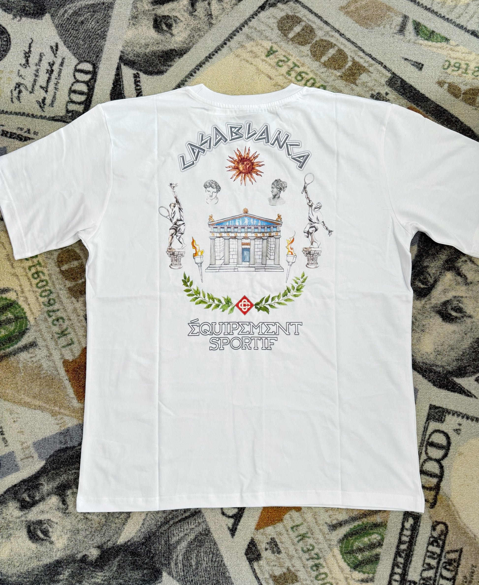 Camiseta Casablanca “Le Temple Du Sport” en color blanco con gráfico frontal inspirado en temática deportiva, combinando estética urbana con diseño elegante y distintivo.