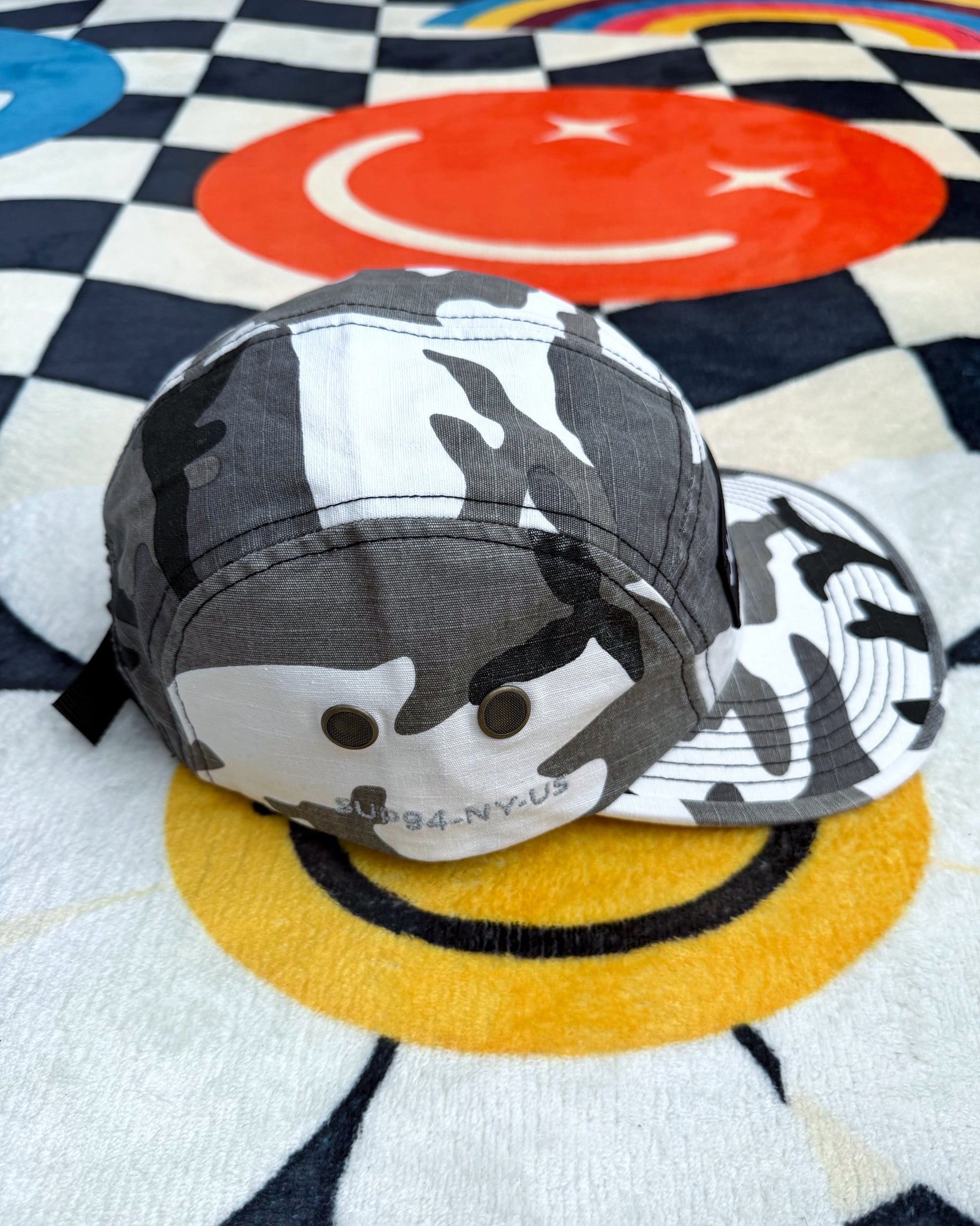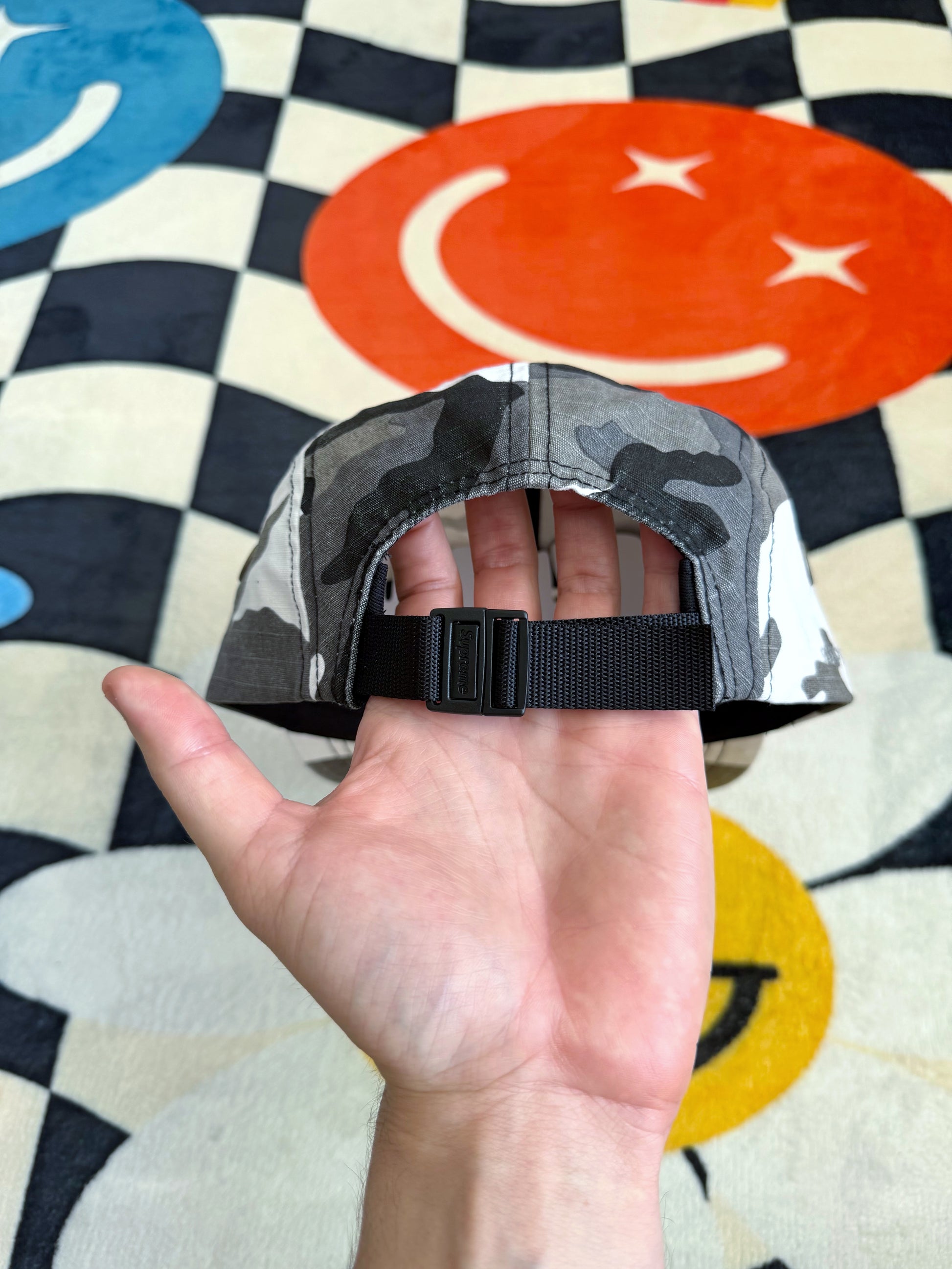 Gorra Supreme con diseño camuflado militar, que aporta un look robusto y urbano al estilo clásico de la Camp Cap. Una pieza versátil ideal para complementar outfits streetwear.