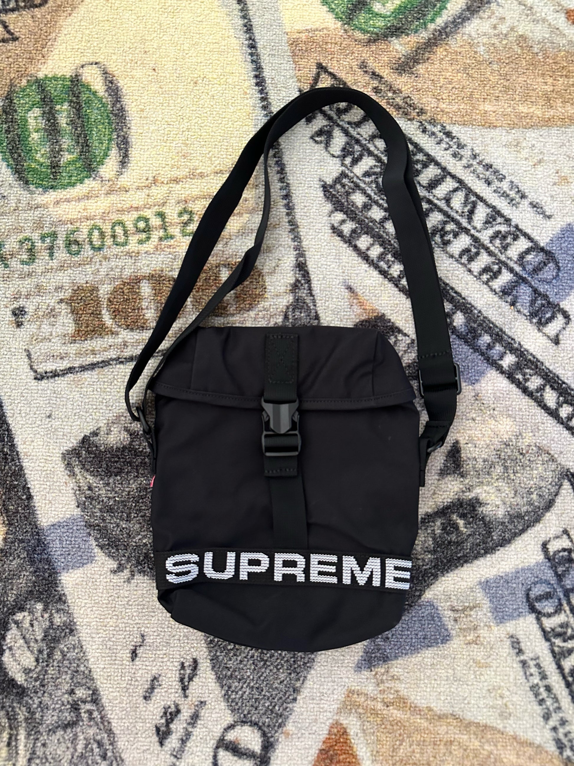 Bolso tipo shoulder bag Supreme en color negro con logo frontal, ideal para un look urbano y funcional dentro del streetwear.